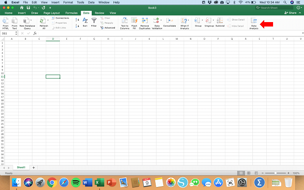 Para saber si tu pestaña Data Analysis está activada, abre un libro de Excel en blanco. Haz clic en la pestaña de datos en la parte superior. ¿Ves una subpestaña con la etiqueta “Analysis” o “Data Analysis”? Si no es así, realiza los siguientes pasos: