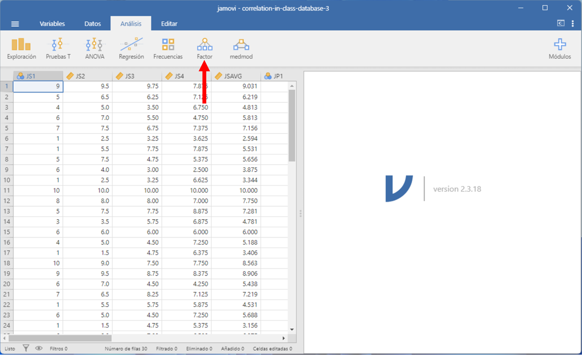 Una vez abiertos los datos, el primer paso es hacer clic en el botón Factor de la parte superior.