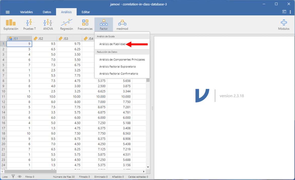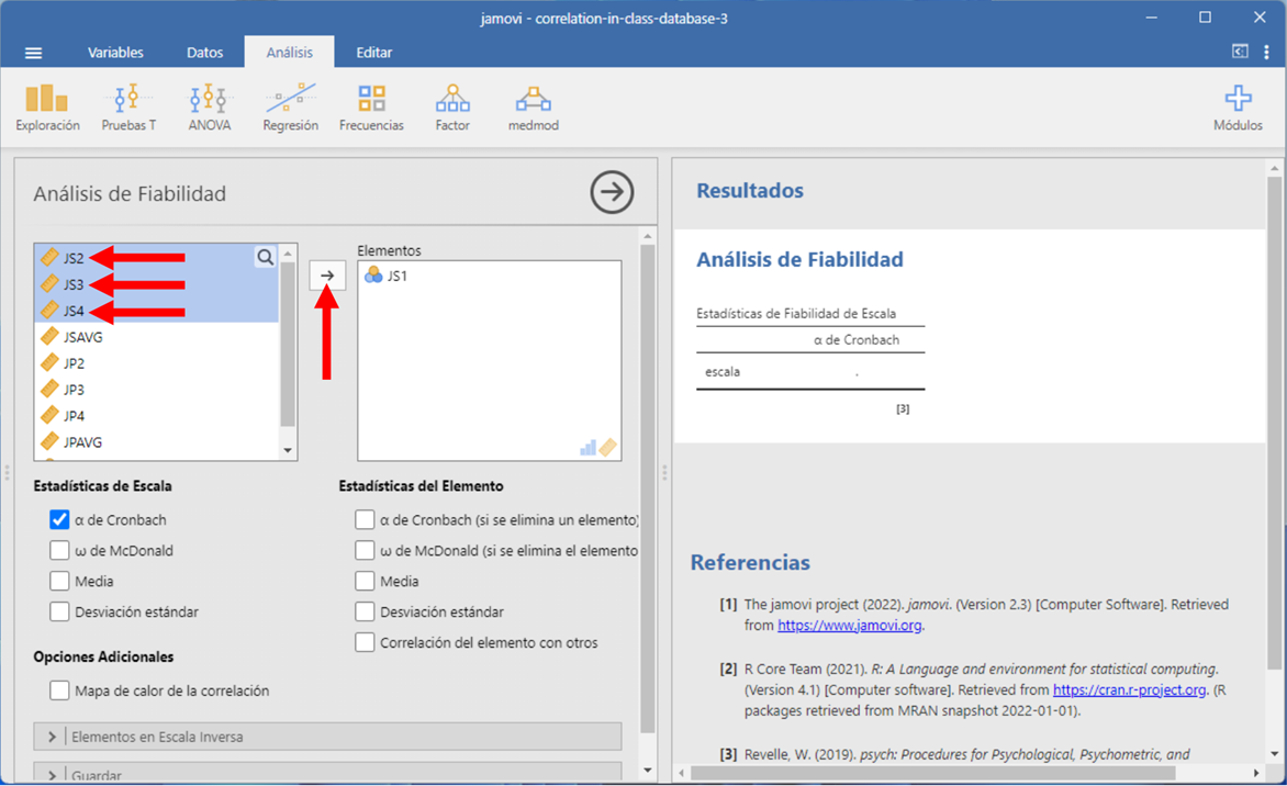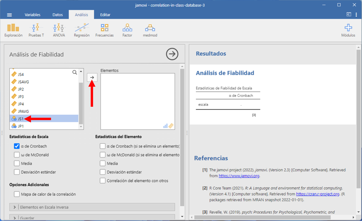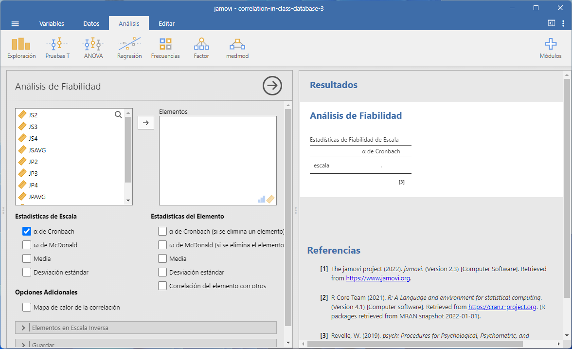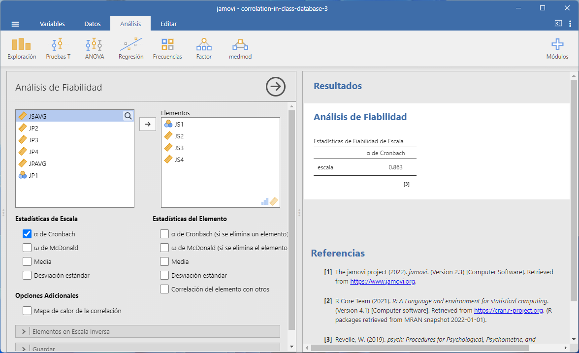 Jamovi calcula automáticamente nuestro alfa de Cronbach. ¡Qué bien!