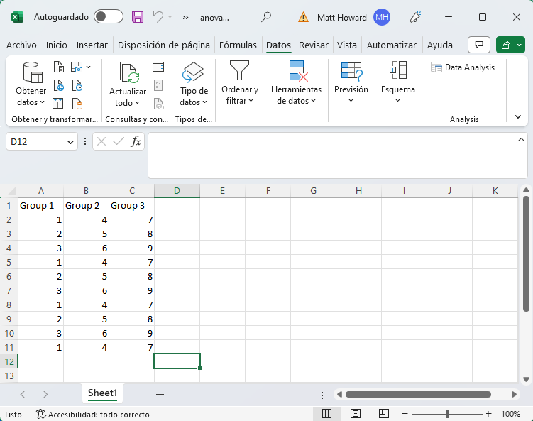 Ahora que sabemos para qué se utiliza un ANOVA, podemos calcular un ANOVA en Excel. Para empezar, abra sus datos en Excel. Si no tiene un conjunto de datos, descargue el conjunto de datos de ejemplo aquí. En el conjunto de datos de ejemplo, simplemente estamos comparando las medias de tres grupos diferentes en un único resultado continuo. Puede imaginar que los grupos y el resultado son cualquier cosa que desee.
