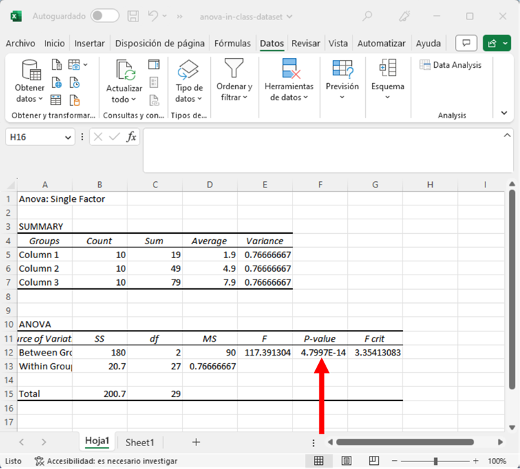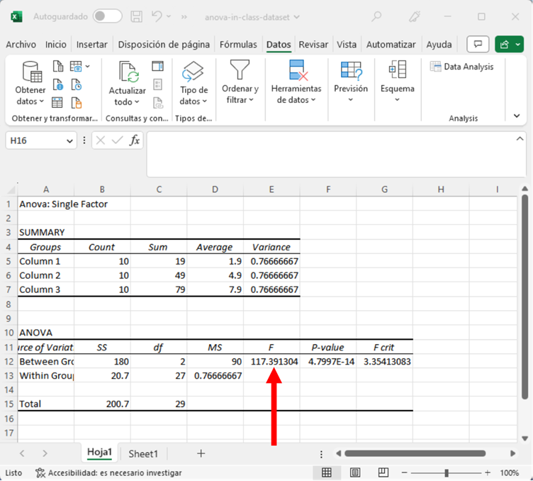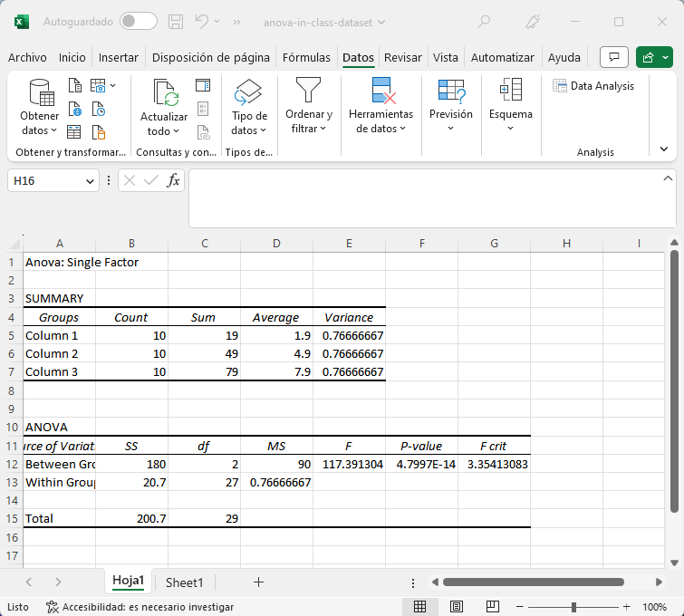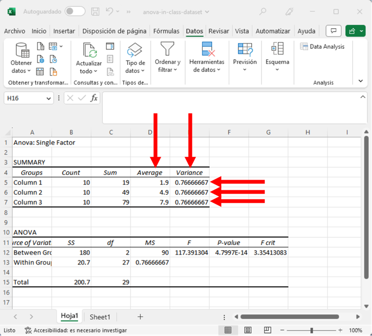 El mejor método para comprender la naturaleza de estas diferencias sería realizar pruebas post hoc. Lamentablemente, Excel no dispone de un método sencillo para calcular pruebas post hoc. Por ello, nos limitaremos a observar las medias en relación con sus varianzas, que también pueden encontrarse en nuestros resultados.