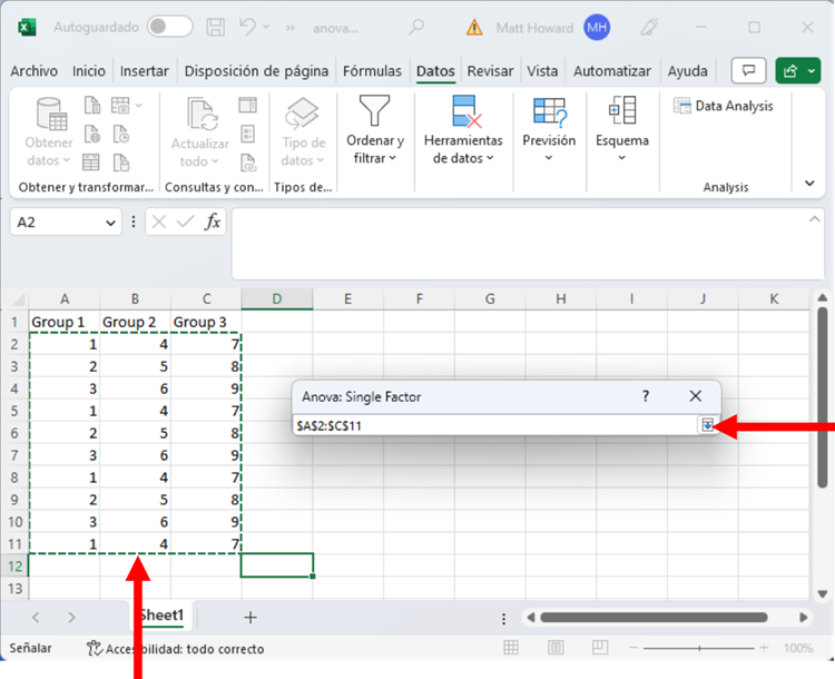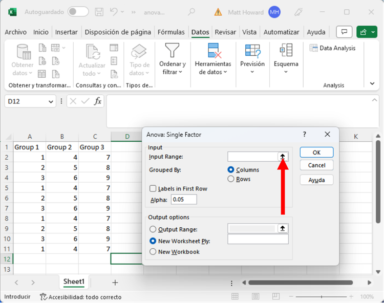 Si sus datos no tienen este aspecto, probablemente debería reformatearlos para que aparezcan de forma similar. Calcular un ANOVA en Excel puede ser un poco difícil con diferentes formatos de datos.