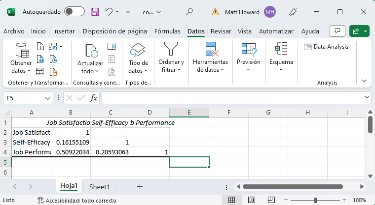 Por supuesto, hay más matices en las correlaciones, pero lo mantendremos simple para este post. En cualquier caso, para responder a este tipo de preguntas, podemos utilizar Excel para calcular los coeficientes de correlación. Si no tienes un conjunto de datos, puedes descargar el conjunto de datos de ejemplo aquí. En el conjunto de datos, investigamos las relaciones entre la Satisfacción Laboral, la Autoeficacia y el Rendimiento Laboral.