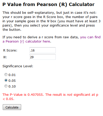 Pero, ¿cómo podemos saber si son estadísticamente significativos? Lamentablemente (y estúpidamente), Excel no proporciona valores p, así que tenemos que ir a otro sitio para hacerlo. Mi sitio web favorito para encontrar el valor p de una correlación es el siguiente:http://www.socscistatistics.com/pvalues/pearsondistribution.aspx . Sólo tienes que introducir la correlación y el tamaño de la muestra y hacer clic en Calcular. Para la relación entre la Satisfacción Laboral y la Autoeficacia, introduciríamos 0,16 para la correlación y 29 para el tamaño de la muestra, como se ve más abajo.