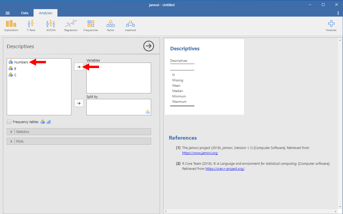 Now, let’s learn how to calculate descriptive statistics in Jamovi. To begin, open your data in Jamovi. If you don’t have a dataset, just copy or type the data below. To change the label from “A” to “Numbers” in Jamovi, double click the title of the column. You can then replance “A” with “Numbers”, and then click the arrow pointing up in a circle.