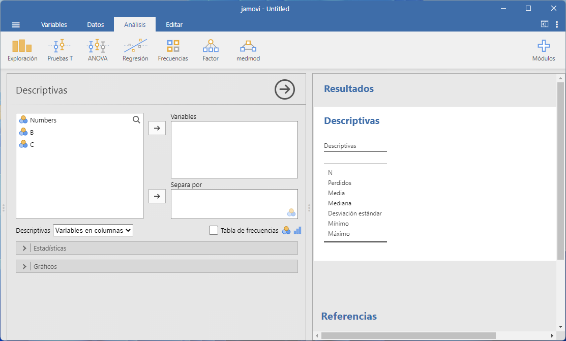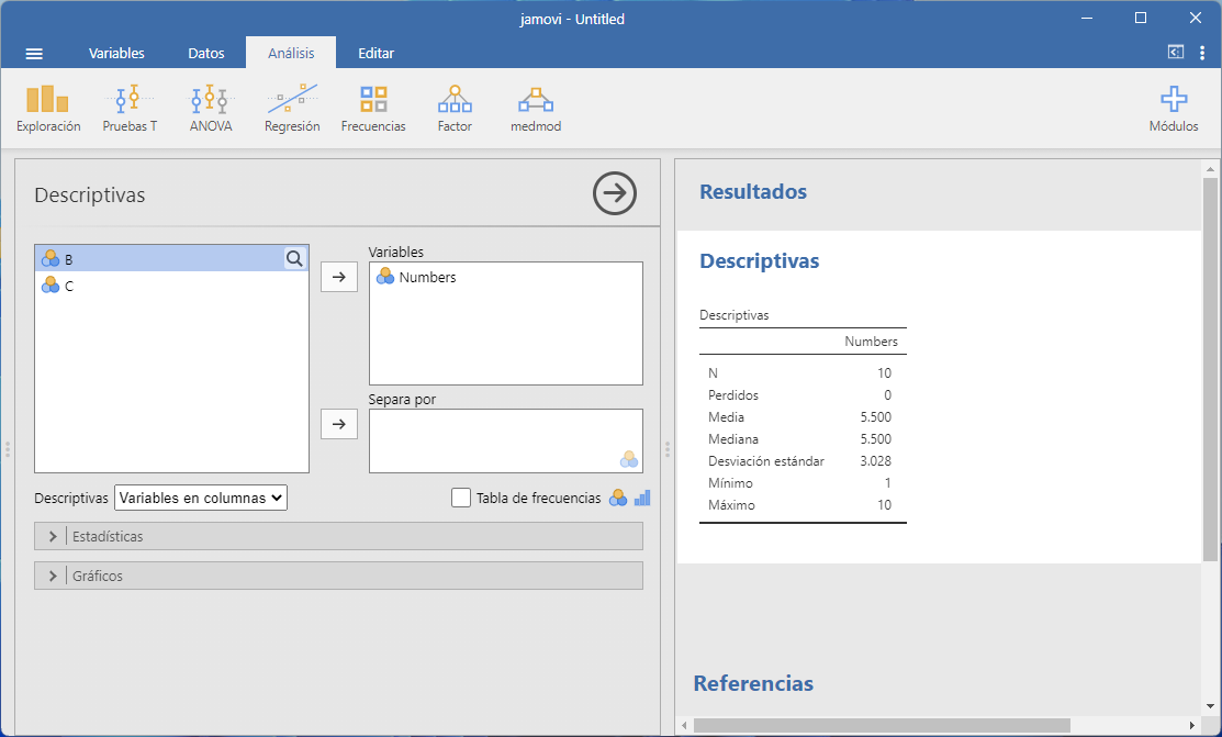 Como verá en la parte derecha de la ventana, Jamovi calcula automáticamente nuestros estadísticos descriptivos cuando movemos nuestra variable a esta casilla. ¡Genial!