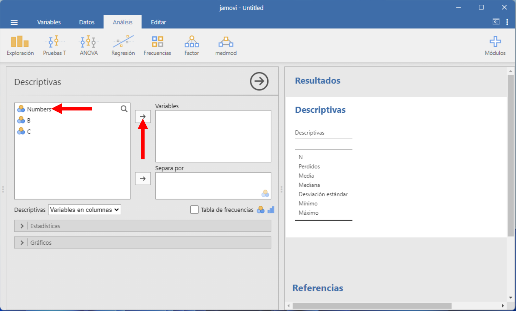 Para calcular nuestros estadísticos descriptivos, vamos a hacer clic en nuestra variable de interés (Numbers). A continuación, vamos a hacer clic en la flecha que apunta a la derecha junto al cuadro “Variables”.