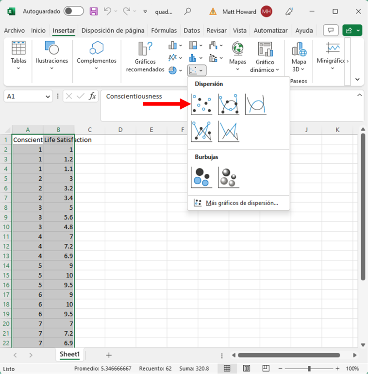 Primero, comencemos haciendo un gráfico simple de los datos en Excel. Resalta tus datos haciendo clic y arrastrando, luego clic en el botón resaltado a continuación.