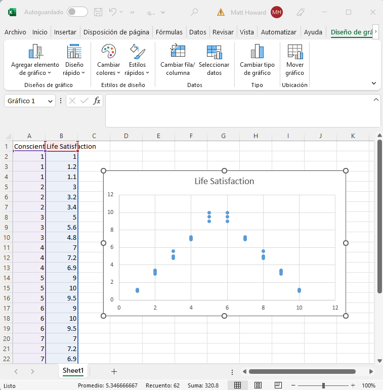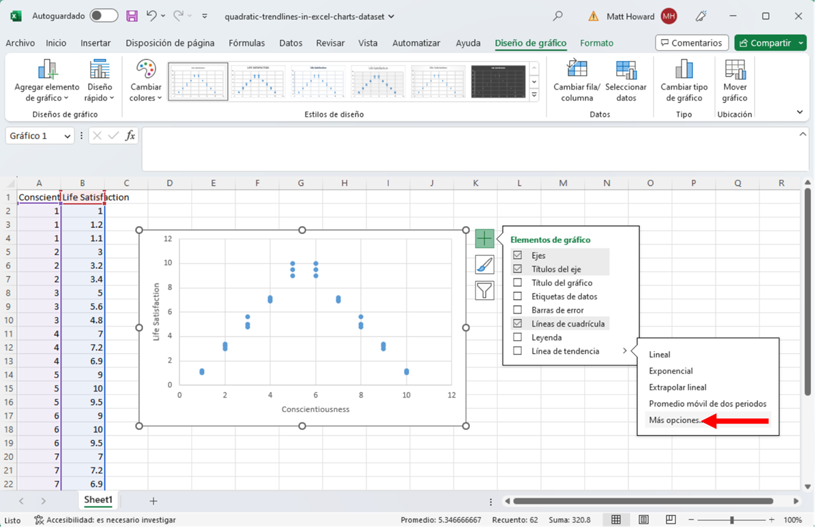 Una regresión cuadrática modela una relación usando una sola curva, al igual que el efecto “algo demasiado bueno”. Si necesitas un repaso sobre el propósito de la regresión cuadrática, consulta mi guía sobre el cálculo de regresiones cuadráticas en Excel. A veces es difícil saber cuándo aplicar la regresión cuadrática, pero crear un diagrama de dispersión y agregar una línea de tendencia cuadrática puede ayudarte a tomar esta decisión. Afortunadamente, podemos hacer esto en Excel.