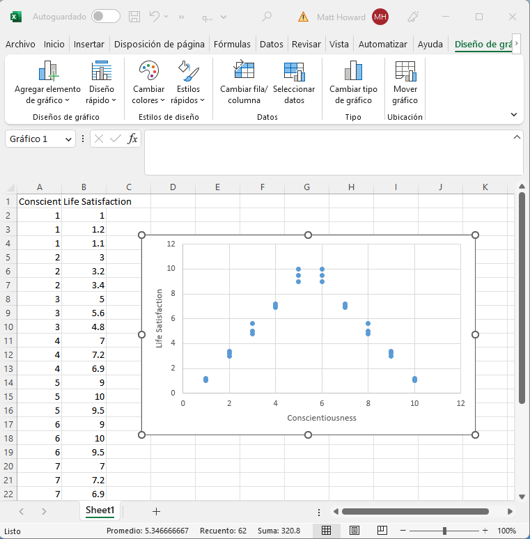 Como puedes ver, tenemos una variable predictora (escrupulosidad) y una variable de resultado (satisfacción con la vida).