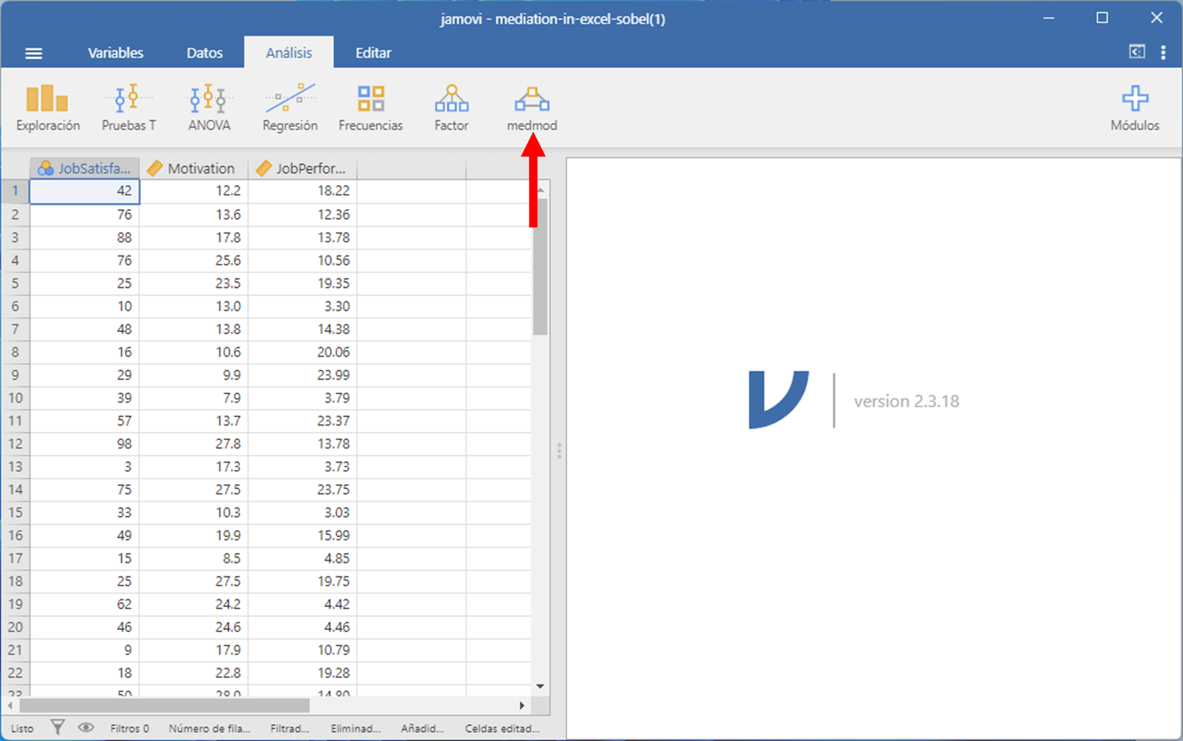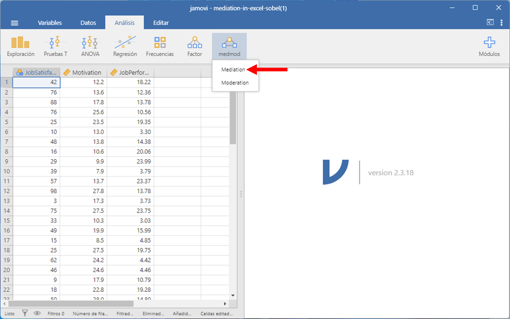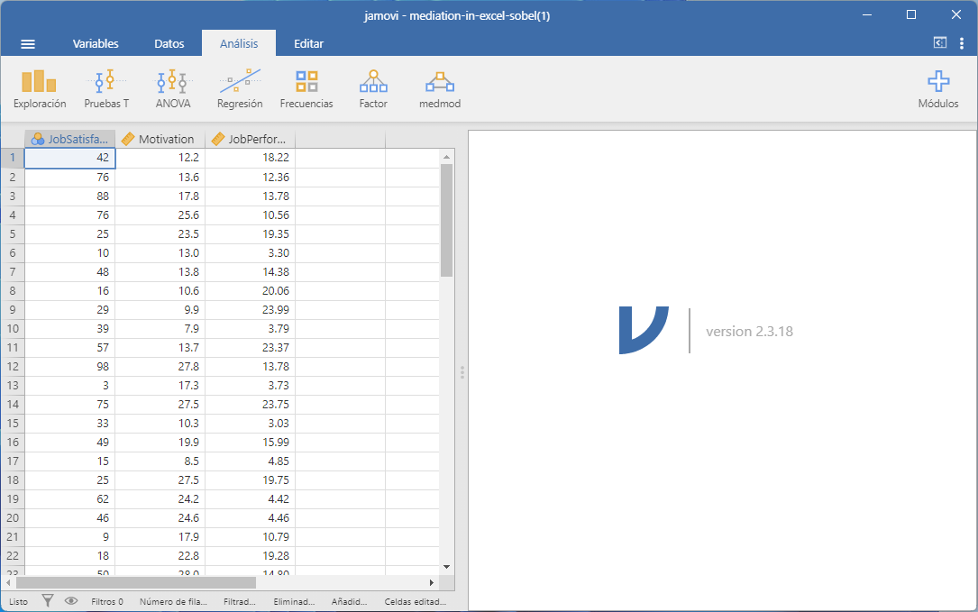 En investigación, la mayoría de las veces comprobamos los efectos directos. Es decir, un efecto directo es una relación entre un predictor y un resultado, como la Satisfacción Laboral que predice el rendimiento laboral. Sin embargo, a veces queremos comprobar si una tercera variable explica la relación entre otras dos variables, como si la motivación explica la relación entre la Satisfacción Laboral y el rendimiento laboral. A esto lo llamamos a menudo efecto mediador o efecto indirecto, que puede comprobarse en Jamovi. Esta página te enseñará cómo hacerlo. Si tienes alguna pregunta después de leerla, envíame un correo electrónico a MHoward@SouthAlabama.edu.