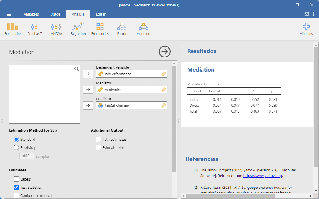 En esta ventana, la primera línea representa el efecto indirecto, que nos indica si nuestra variable mediadora era realmente un mediador estadísticamente significativo. En este ejemplo, vemos que el valor p asociado con el efecto indirecto fue de 0.58. Como este valor es superior a 0.05, no es estadísticamente significativo. Dado que es superior a 0.05, no es estadísticamente significativo y determinaríamos que la motivación no fue un mediador significativo del efecto entre la satisfacción laboral y el rendimiento laboral.