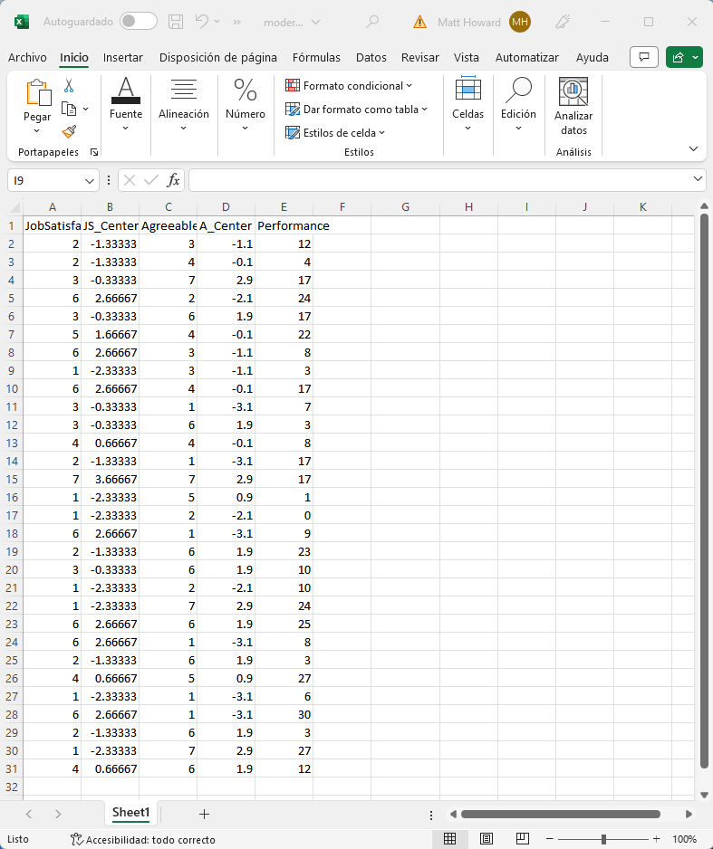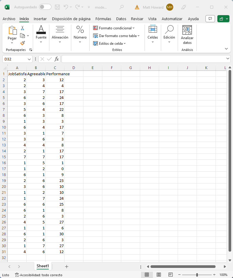 El tipo más básico de análisis de moderación en Excel incluye un único predictor, un único moderador y un único resultado. Por supuesto, aquí es donde empezaremos. Si no tienes un conjunto de datos, puedes descargar el conjunto de datos de ejemplo aquí. En este conjunto de datos, investigamos el efecto directo de la Satisfacción Laboral sobre el Rendimiento, y también comprobamos si la Amabilidad modera esta relación.