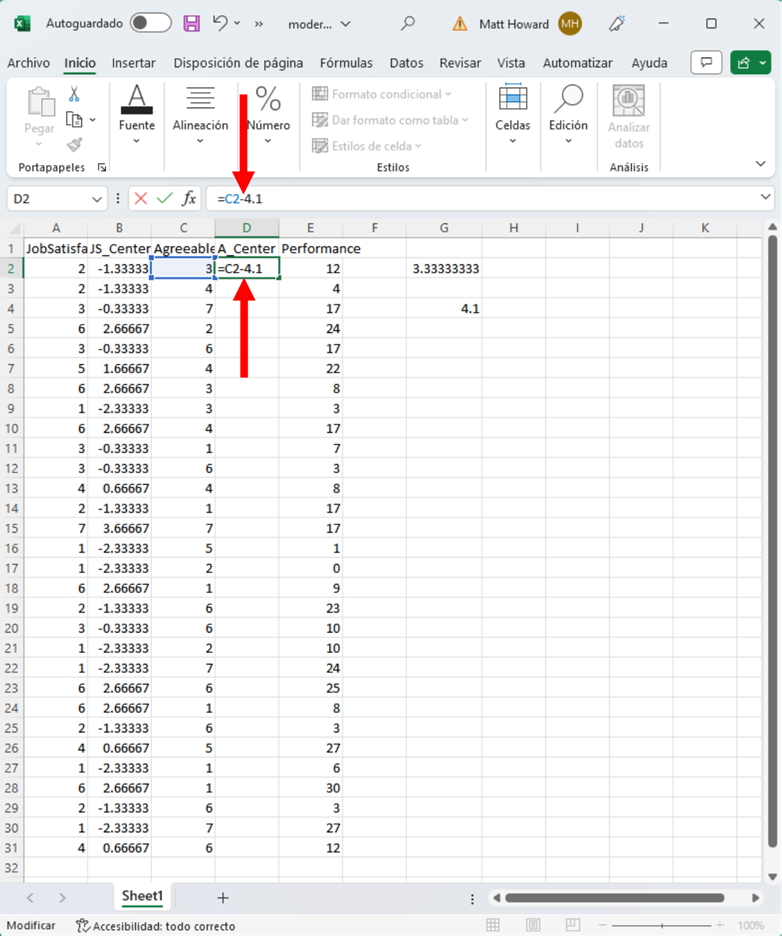 Hagamos lo mismo para Amabilidad. En la primera celda, escriba “=”, haz clic en la primera celda Amabilidad, escribe “-4.1”, y pulsa Intro.