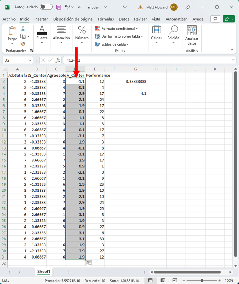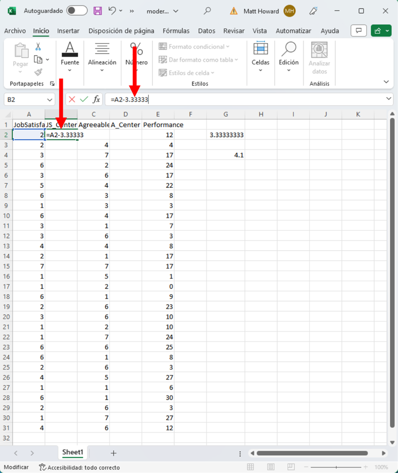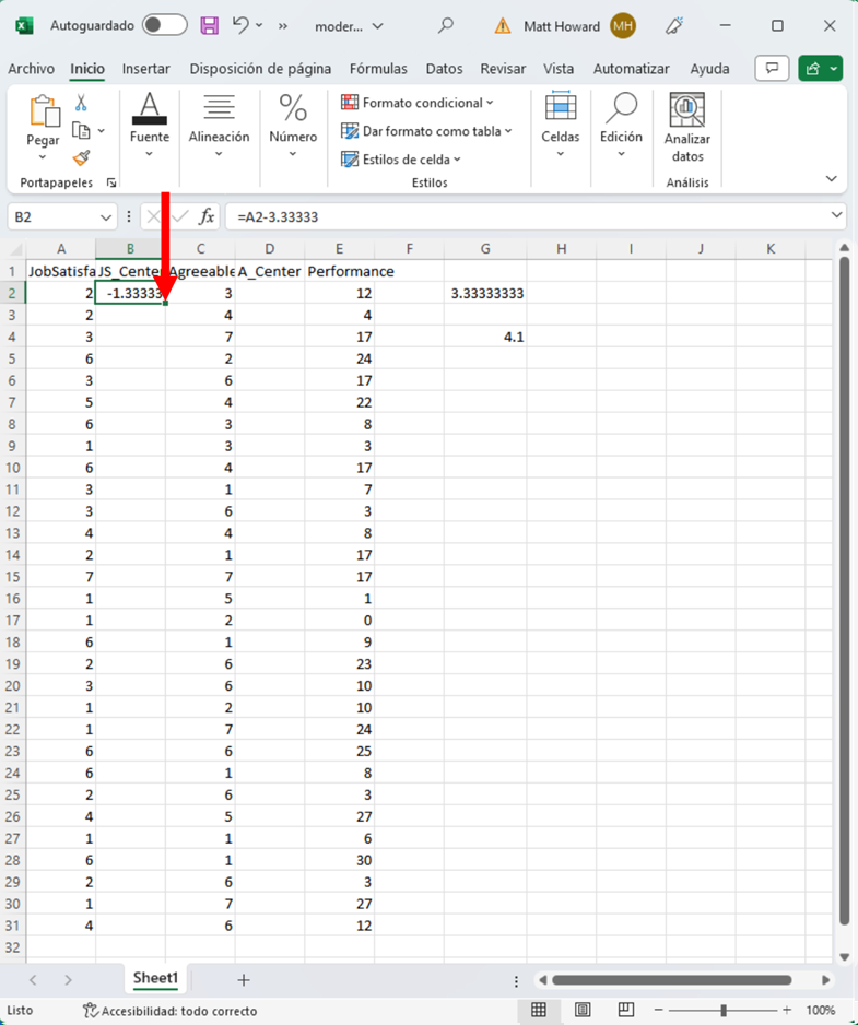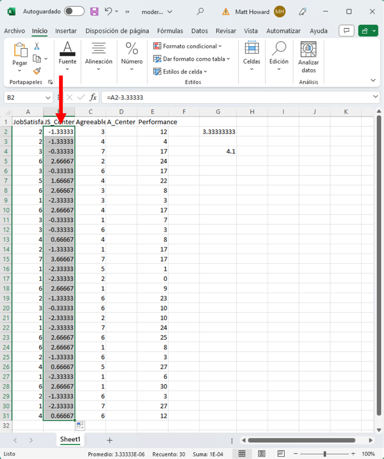 Comencemos con la primera celda de Satisfacción Laboral. En la columna JS_Centered (que se ve abajo), escribe “=”, haz clic en la primera celda de Satisfacción Laboral, escribe “-3.333333” y presiona Intro. Esto calculará el valor centrado en la media para la primera observación de Satisfacción Laboral.
