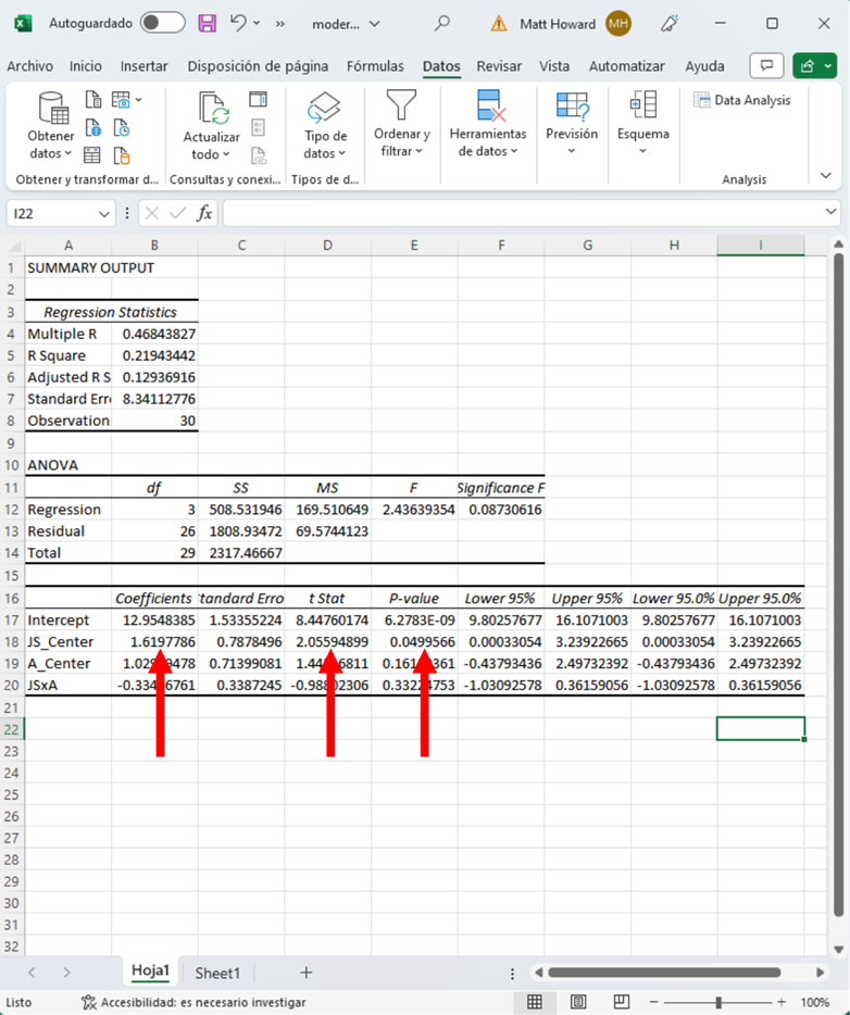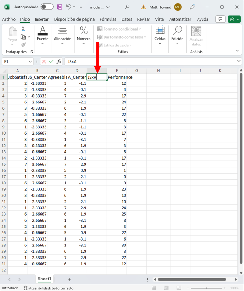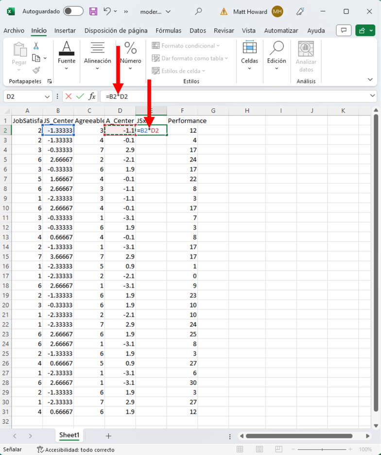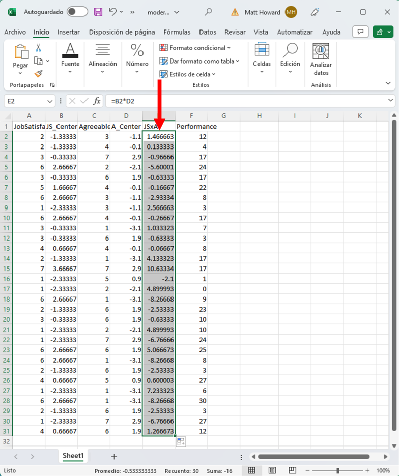 Para crear el término de interacción, tenemos que multiplicar las dos columnas respectivas centradas en la media. Empecemos por la primera fila para hacerlo. En la primera celda de la nueva columna del término de interacción, escribe “=”, haz clic en la primera celda de la columna JS_Centered, escribe “*”, haz clic en la primera celda de la columna A_Centered y presiona Intro. Esto debería producir los dos números multiplicados en esa columna.