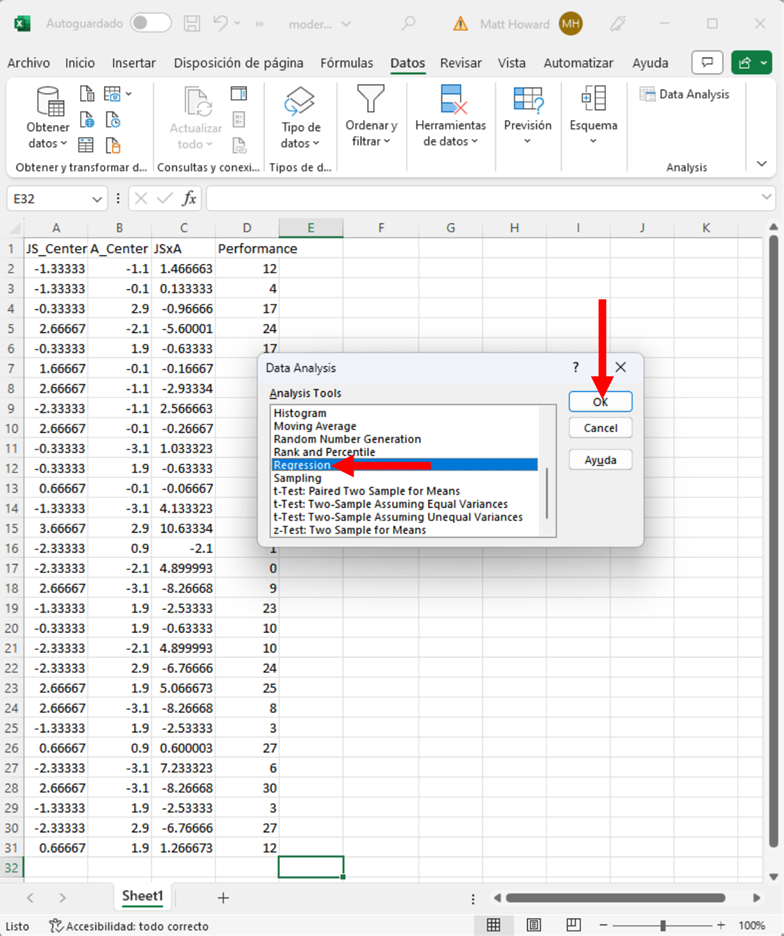 Haz clic en Regression y luego en el botón OK.