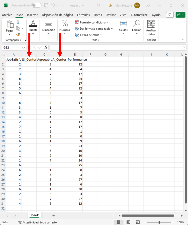 Para empezar, tenemos que centrar la media de nuestro predictor y moderador. Para ello, restamos cada valor del predictor por su media, así como restamos cada valor del moderador por su media. Por lo tanto, tenemos que seguir adelante y añadir columnas para mantener estos valores centrados en la media. Yo siempre añado las nuevas columnas junto a las variables que quiero centrar en la media. Añade también un título a estas columnas, como se ve en la imagen de abajo.