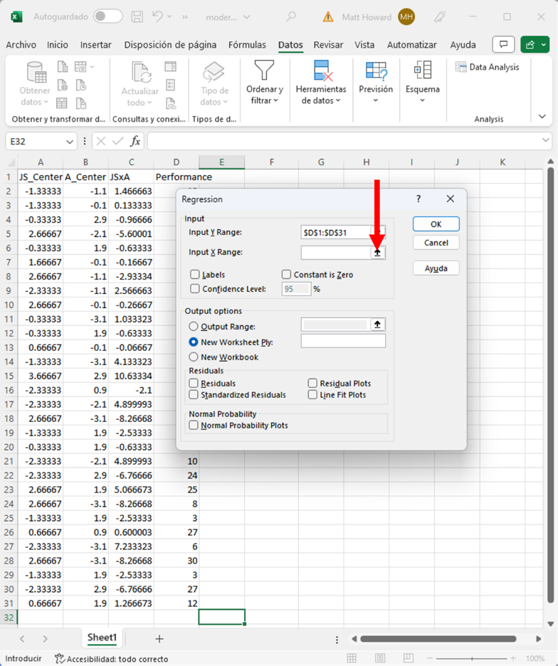 Pulsa el botón resaltado para indicarle a Excel dónde se encuentran los datos de tu predictor.