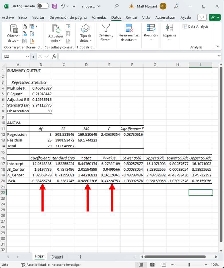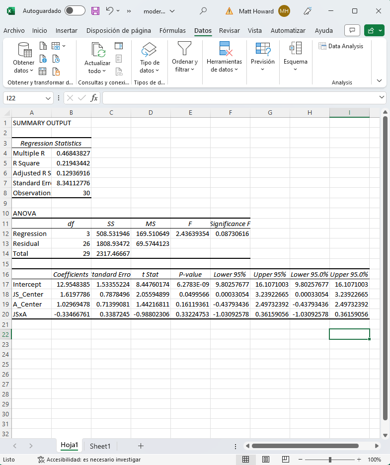 La mayoría de los análisis que reviso en MattCHoward.com sólo tienen en cuenta los efectos directos; es decir, la relación directa entre un predictor y un resultado, como la Satisfacción Laboral que predice el Rendimiento Laboral. Sin embargo, a veces queremos probar si una variable influye en la relación entre otras dos variables, como por ejemplo si la amabilidad influye en la relación entre la Satisfacción Laboral y el Rendimiento Laboral. A esto lo llamamos efecto moderado o interactivo, y puede probarse en Excel. Esta página te enseñará cómo hacerlo. Si tienes alguna pregunta después de leer, no dudes en enviarme un correo electrónico a MHoward@SouthAlabama.edu.