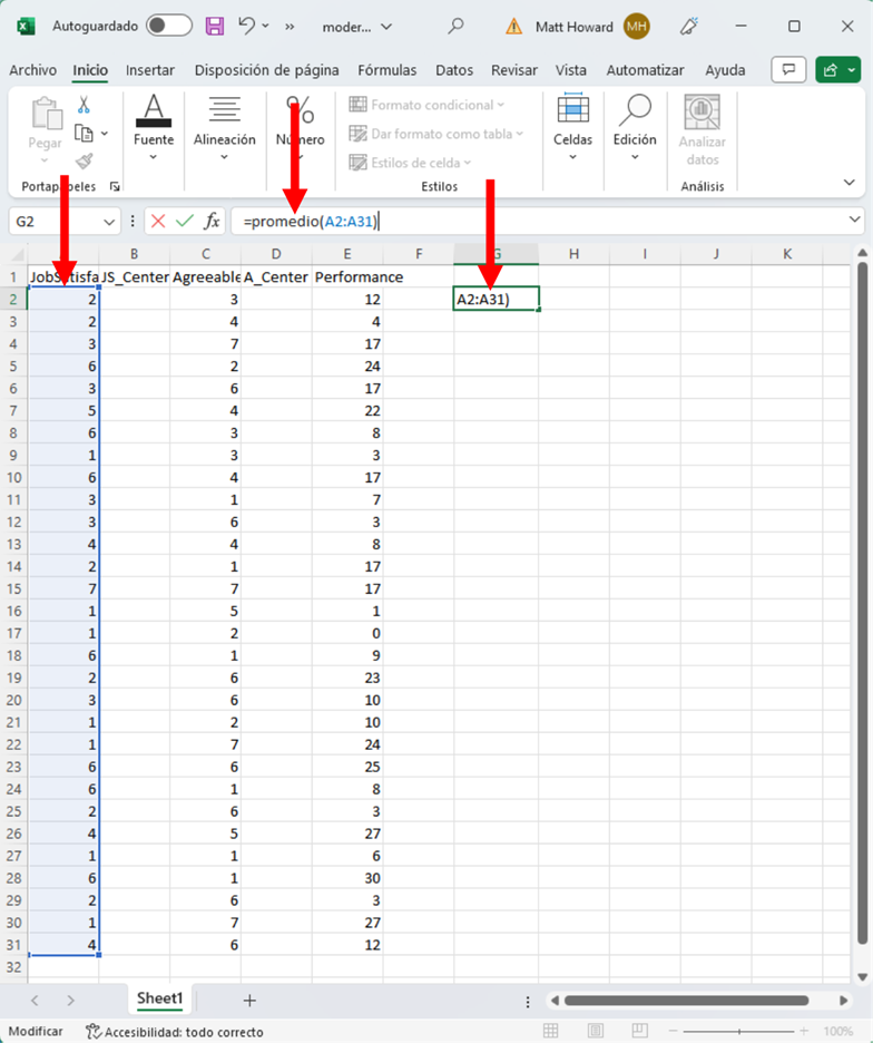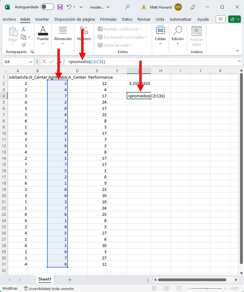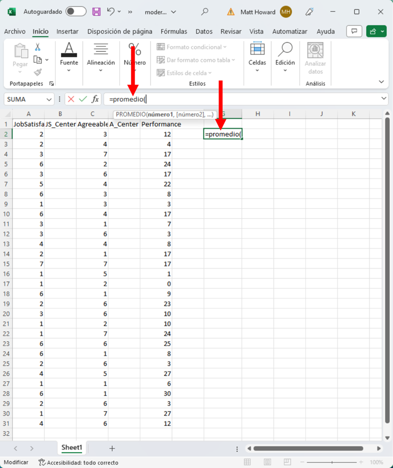 Ahora necesitamos determinar las medias de las variables Satisfacción Laboral y Amabilidad. En una celda al lado, escribe “=promedio(” (sin las comillas para todas las direcciones).