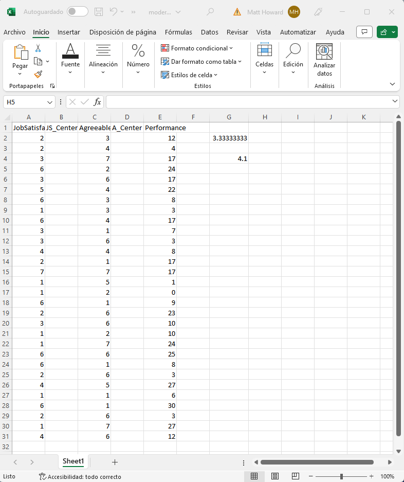 Ahora deberíamos tener las medias de Satisfacción Laboral y Amabilidad. Si estás utilizando el conjunto de datos de ejemplo, son 3.33333 y 4.1, respectivamente.