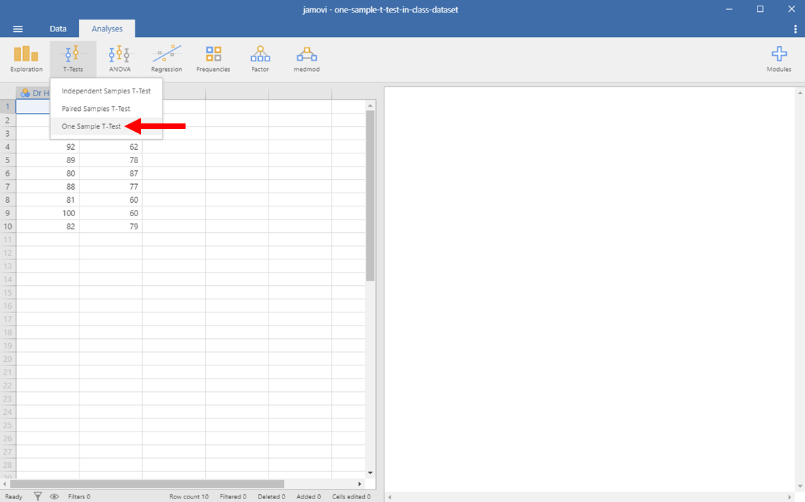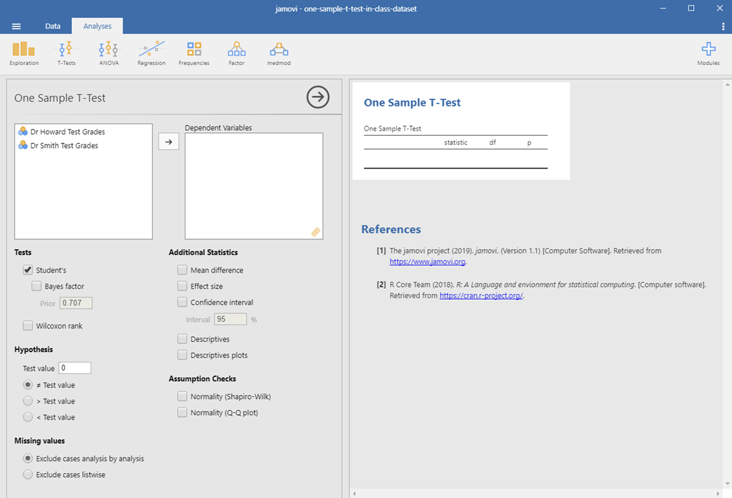 Now that we know what a one-sample t-test is used for, we can now calculate a one-sample t-test in Jamovi! To begin, open your data in Jamovi. If you don’t have a dataset, download the example dataset here. In the example dataset, we are comparing the test grades of Dr. Howard’s class and Dr. Smith’s class (separately) to a value of 80. This will determine whether the student’ average grades in the two classes are significantly different from a value of 80.
