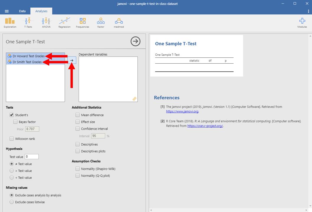 We want to assess the difference of Dr. Howard’s Test Grades from a value of 80, and we want to assess the difference of Dr. Smith’s Test Grades from a value of 80. Although these are two separate analyses, we can conduct them at the same time in Jamovi. To do so, we want to move the variables, Dr Howard Test Grades and Dr Smith Test Grades, into the “Dependent Variables” box. To do this, we can click on these variables, and then we click on the right-facing arrow next to the “Dependent Variables” box.