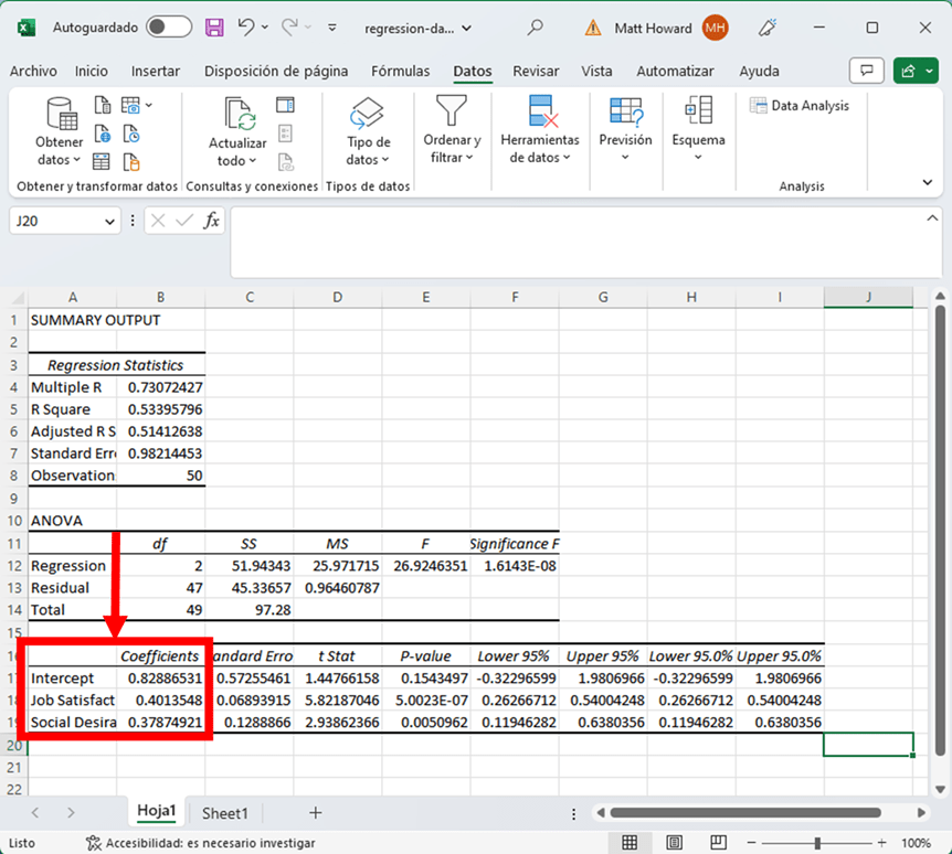 La lista de ejemplos podría ser interminable. Sin embargo, para estimar un valor del resultado a partir de determinados valores del predictor o predictores, primero tenemos que realizar un análisis de regresión. Si no dispone de un conjunto de datos, puede descargar el conjunto de datos de ejemplo aquí. En el conjunto de datos, estamos investigando las relaciones de la satisfacción laboral y la deseabilidad social con el rendimiento laboral. Ejecuta la regresión utilizando todos los predictores. En el ejemplo, la satisfacción laboral y la deseabilidad social predeciría el rendimiento laboral. Si necesitas ayuda para realizar este análisis para este ejemplo, consulta mi guía sobre Regresión en Excel.
