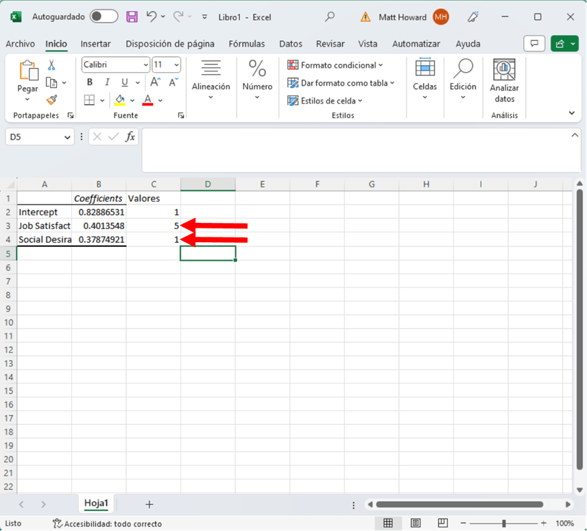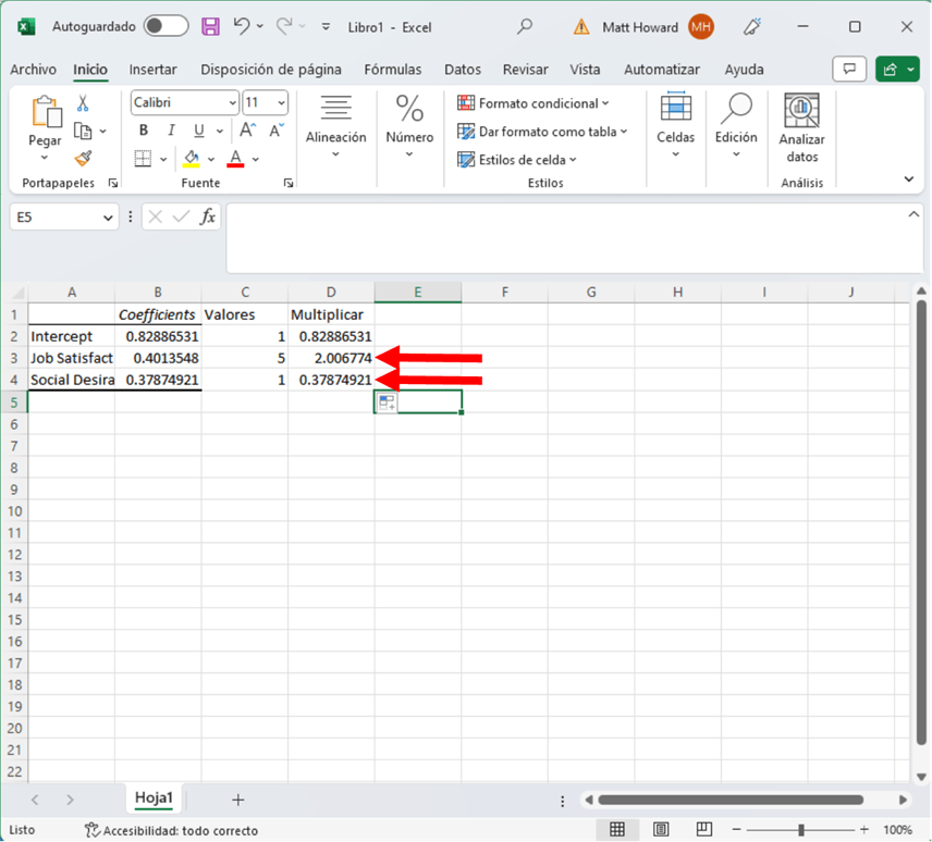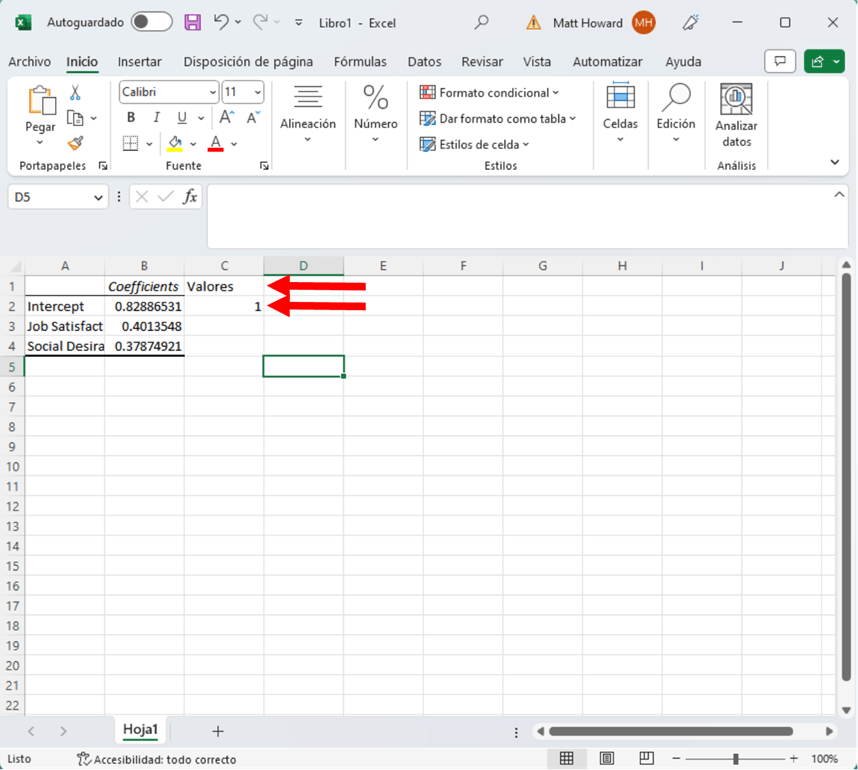 A continuación, introduzca los valores especificados para la satisfacción laboral y la deseabilidad social en las celdas situadas debajo del “1”. En este ejemplo, vamos a elegir los valores de “5” para la satisfacción laboral y “1” para la deseabilidad social. Esto significa que queremos predecir el valor del desempeño laboral de un empleado cuando su satisfacción laboral es 5 y su deseabilidad social es 1.