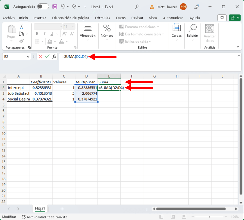 Vamos a querer predecir el resultado mediante el uso de los coeficientes beta no estandarizados, que sólo están etiquetados como “Coefficients” en la salida de Excel. Multiplicamos estos coeficientes por los valores especificados de los predictores para predecir nuestro resultado. Como puede ver, la ecuación de regresión no estandarizada de estos resultados fue: y = .829 + .401(JS) + .379(SD). Por lo tanto, vamos a utilizar Excel para multiplicar .401*JS así como .379*SD, antes de sumarlo todo para obtener nuestro valor predicho. Si esto te resulta confuso, no dejes de ver mi vídeo de YouTube sobre “Inferencias con regresión”.