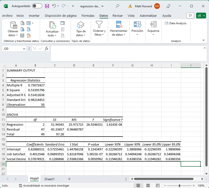 La lista de ejemplos podría ser interminable. Sin embargo, para estimar un valor del resultado a partir de determinados valores del predictor o predictores, primero tenemos que realizar un análisis de regresión. Si no dispone de un conjunto de datos, puede descargar el conjunto de datos de ejemplo aquí. En el conjunto de datos, estamos investigando las relaciones de la satisfacción laboral y la deseabilidad social con el rendimiento laboral. Ejecuta la regresión utilizando todos los predictores. En el ejemplo, la satisfacción laboral y la deseabilidad social predeciría el rendimiento laboral. Si necesitas ayuda para realizar este análisis para este ejemplo, consulta mi guía sobre Regresión en Excel.