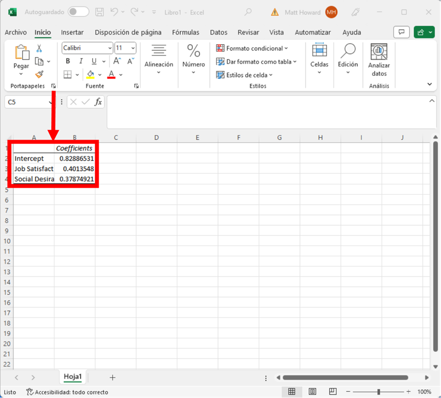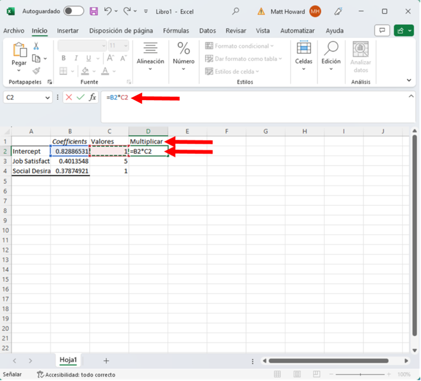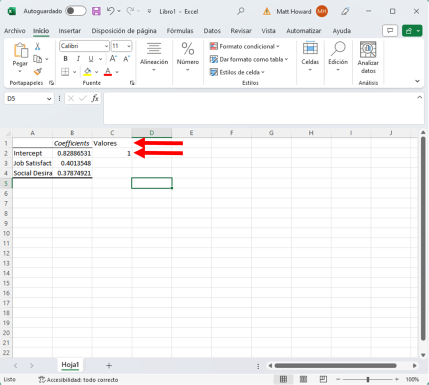 A continuación, introduzca los valores especificados para la satisfacción laboral y la deseabilidad social en las celdas situadas debajo del “1”. En este ejemplo, vamos a elegir los valores de “5” para la satisfacción laboral y “1” para la deseabilidad social. Esto significa que queremos predecir el valor del desempeño laboral de un empleado cuando su satisfacción laboral es 5 y su deseabilidad social es 1.