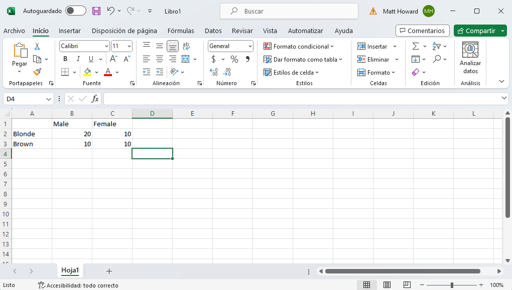 Ahora que sabemos para qué se utiliza una prueba chi-cuadrado de independencia, podemos calcularla en Excel. Para empezar, abre tu conjunto de datos en Excel. Haz clic aquí para ver el conjunto de datos que utilizaré en este ejemplo. Incluye el sexo y el color del pelo de 60 estudiantes seleccionados aleatoriamente, y comprobaremos si existe una asociación entre el sexo y el color del pelo con respecto al número de observaciones para sus respectivas categorías. En otras palabras, ¿el número de hombres o mujeres depende del color del pelo y/o el número de estudiantes rubios o castaños depende del sexo?