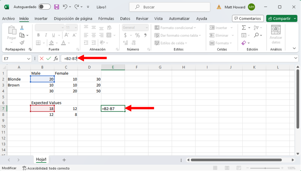 Ahora vamos a restar los valores originales observados por los valores esperados. Empecemos de nuevo con la celda superior izquierda. Primero selecciona una celda en blanco, como la resaltada abajo. Escribe “=”, selecciona el valor observado superior izquierdo, escribe “-“, selecciona el valor esperado superior izquierdo y pulsa intro.