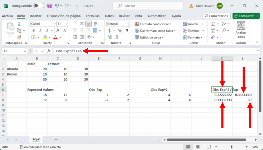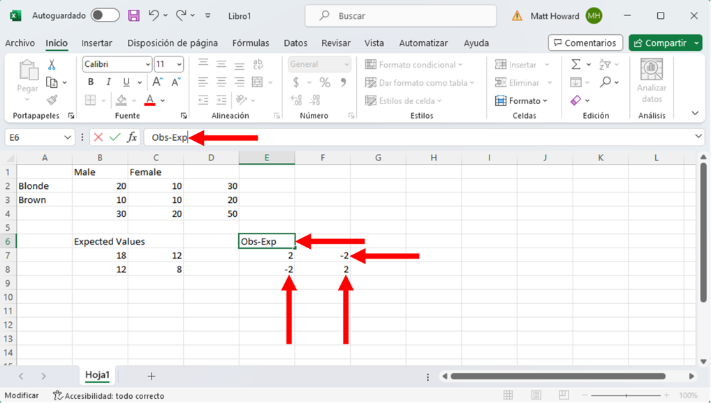 Repitamos el proceso para las otras tres celdas y démosle una etiqueta a su nueva sección. Yo utilicé la etiqueta, “Obs-Exp”.