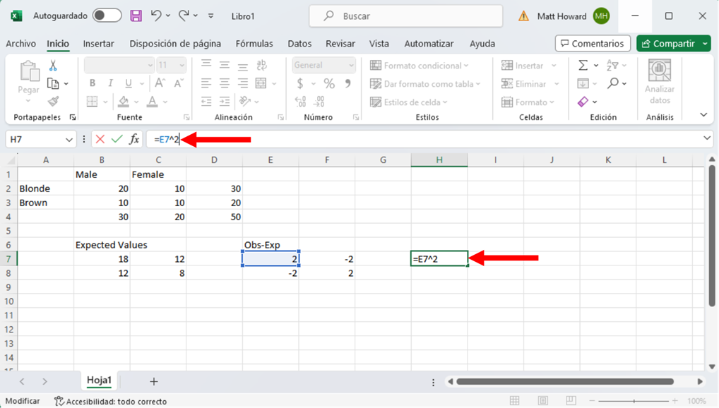 Tenemos que cuadrar estos nuevos valores, empezando por la celda superior izquierda. De nuevo, selecciona una celda en blanco. Luego escribe “=”, selecciona la celda superior izquierda de los valores observados menos los esperados, escribe “^2”, y pulsa intro. Para escribir “^”, mantén pulsada la tecla Mayús y pulsa el número 6 del teclado.