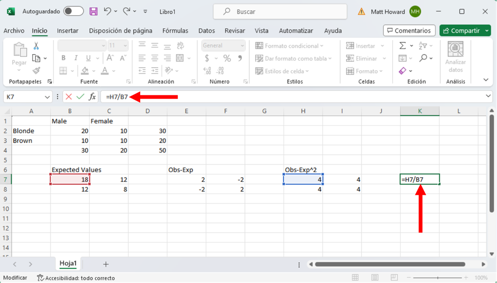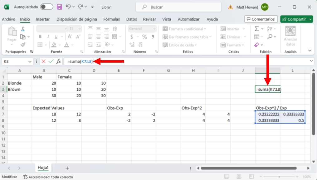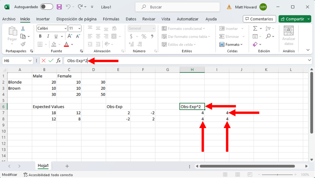 Repitamos el proceso para las otras tres celdas y añadamos una etiqueta. Yo he utilizado la etiqueta “Obs-Exp^2”.