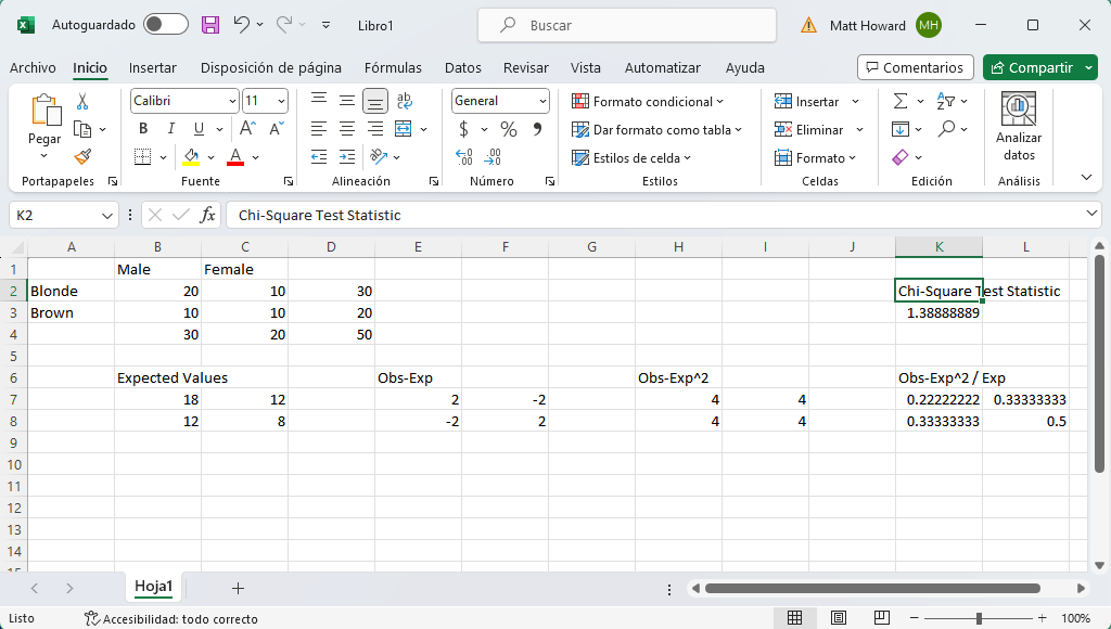 La prueba chi-cuadrado de independencia, también llamada prueba chi-cuadrado de dos variables, es tal vez incluso más popular que la prueba chi-cuadrado de una variable. Al igual que la prueba de chi-cuadrado de una variable, también es una de las pocas estadísticas básicas que el complemento “Data Analysis” de Excel no realiza, y es difícil de calcular sin SPSS, R o un programa estadístico diferente. He creado esta guía sobre el cálculo de la prueba chi-cuadrado de independencia en Excel para ayudarte a resolver este problema. Espero que a alguien le resulte útil. Como siempre, envíame un correo electrónico a MHoward@SouthAlabama.edu si tienes alguna duda sobre la prueba chi-cuadrado de independencia.