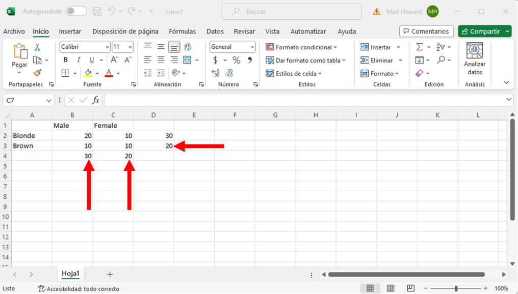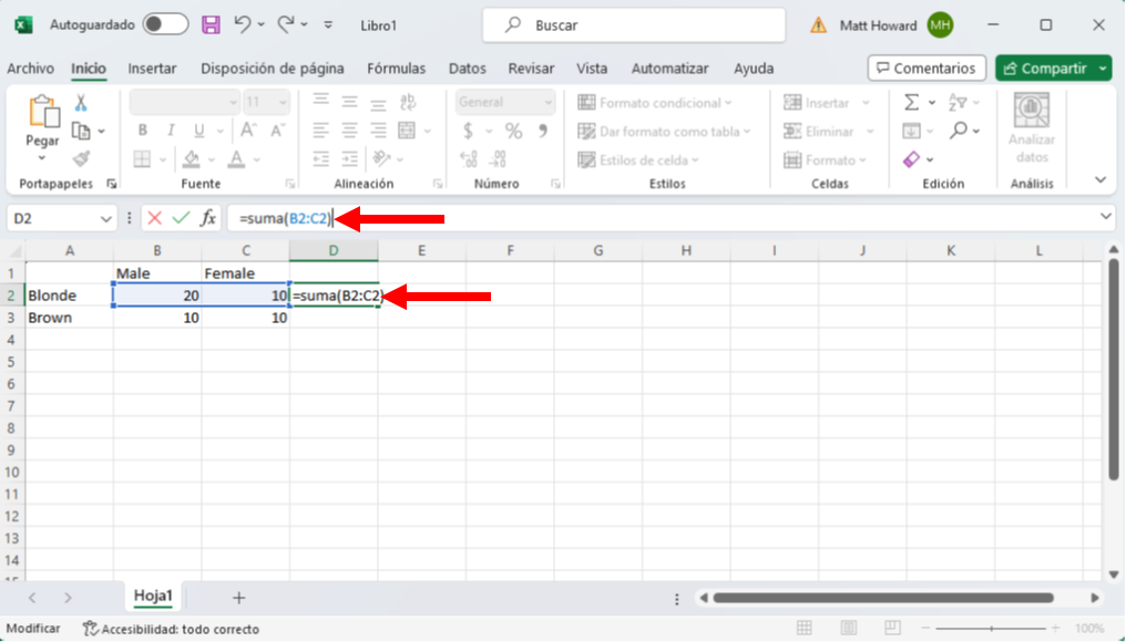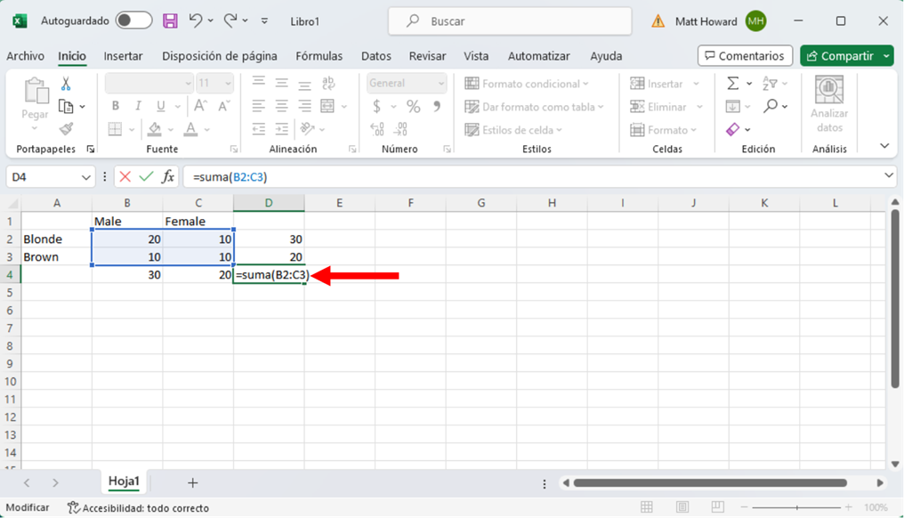 Queremos repetir este proceso para la otra fila y las dos columnas. Basta con utilizar de nuevo la función =SUMA() utilizando las mismas celdas que abajo.