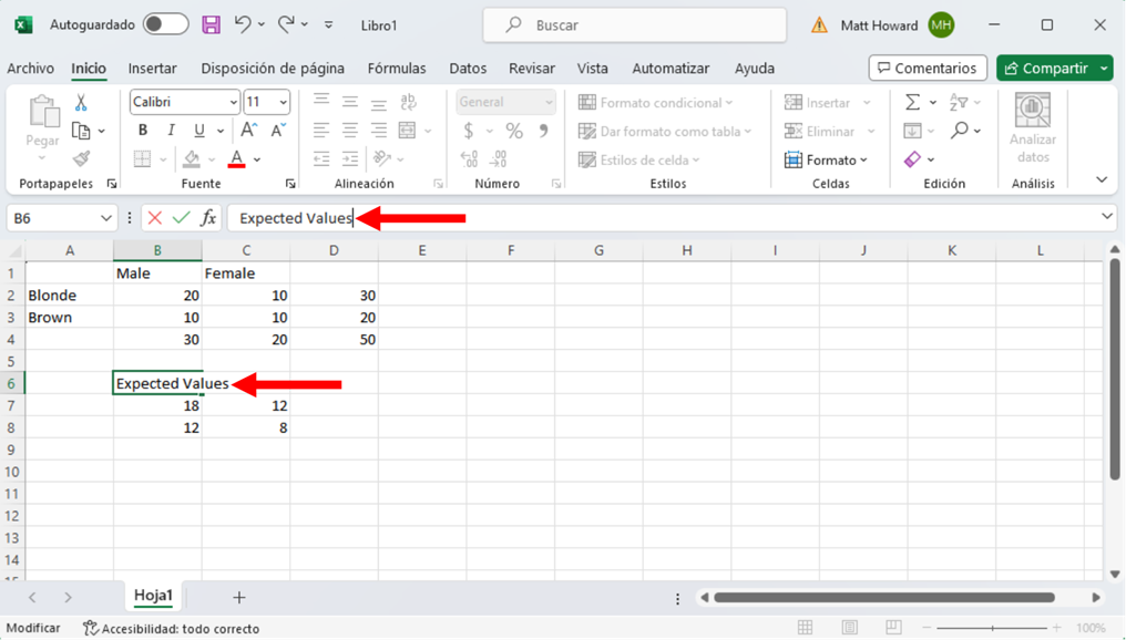 Ahora vamos a etiquetar estas cuatro nuevas celdas. Yo utilicé la etiqueta, “Expected Values”(Valores Esperados).