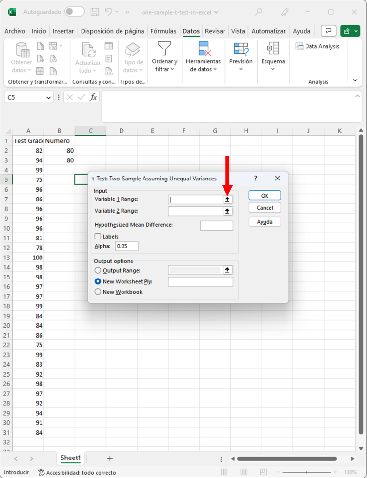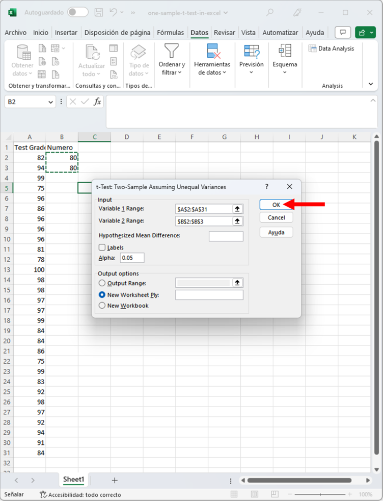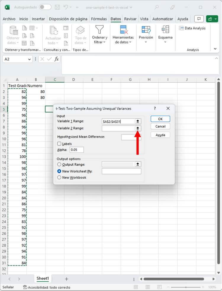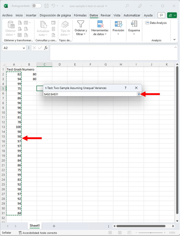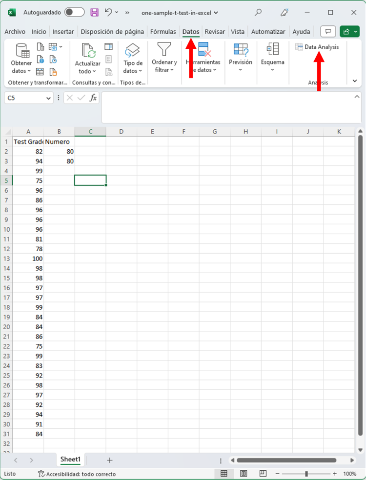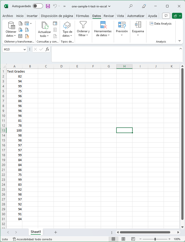 Ahora que sabemos para qué se usa una prueba t de una muestra, ya podemos pasar a calcular una prueba t de una muestra en Excel. Para comenzar, abran sus datos en Excel. Si no tienen un conjunto de datos, descarguen el conjunto de datos de ejemplo aquí. En el conjunto de datos de ejemplo, se comparan las calificaciones en un examen de una clase con un valor elegido de 80. Esto determinará si las calificaciones promedio de los estudiantes son significativamente diferentes de un valor de 80.