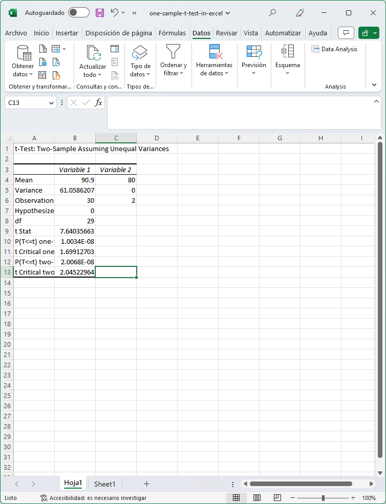 No me encuentro con la necesidad de realizar una prueba t de una muestra con tanta frecuencia, ya sea en la investigación o en la práctica. Sin embargo, es una muy buena introducción para aprender sobre las pruebas t de dos muestras y las ANOVA, por lo que la enseño al principio de mis cursos de estadística de pregrado. Sin embargo, siempre termino un poco irritado cada vez que la enseño, porque Excel no tiene la prueba t de una muestra integrada en su complemento de Análisis de Datos. Sin embargo, podemos engañar a Excel para que lo haga por nosotros, lo cual detallo a continuación. Si tienen alguna pregunta, envíenme un email a MHoward@SouthAlabama.edu.
