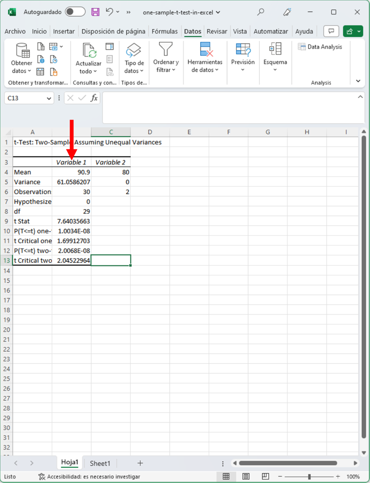 Entonces, ¿qué nos dicen estos números? Primero, miren el número resaltado a continuación. En el ejemplo actual, tenemos un promedio de 90.9. Esto significa que la calificación en el examen de la clase fue, en promedio, de 90.9. Ya podemos confirmar que esto es más grande que nuestro número elegido de 80.