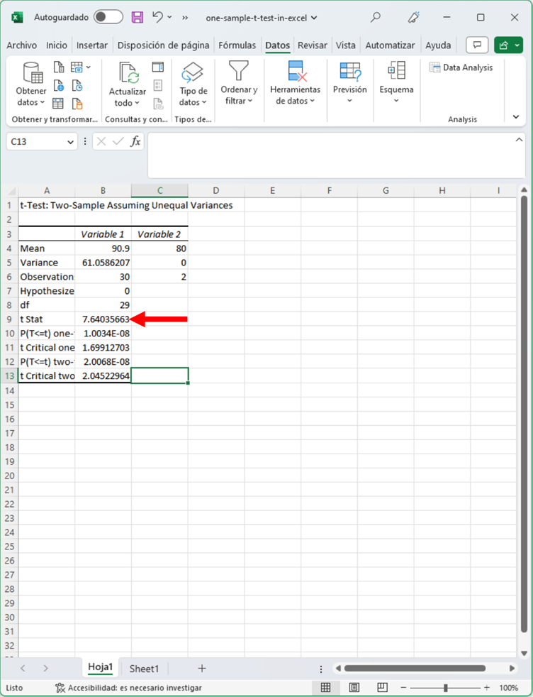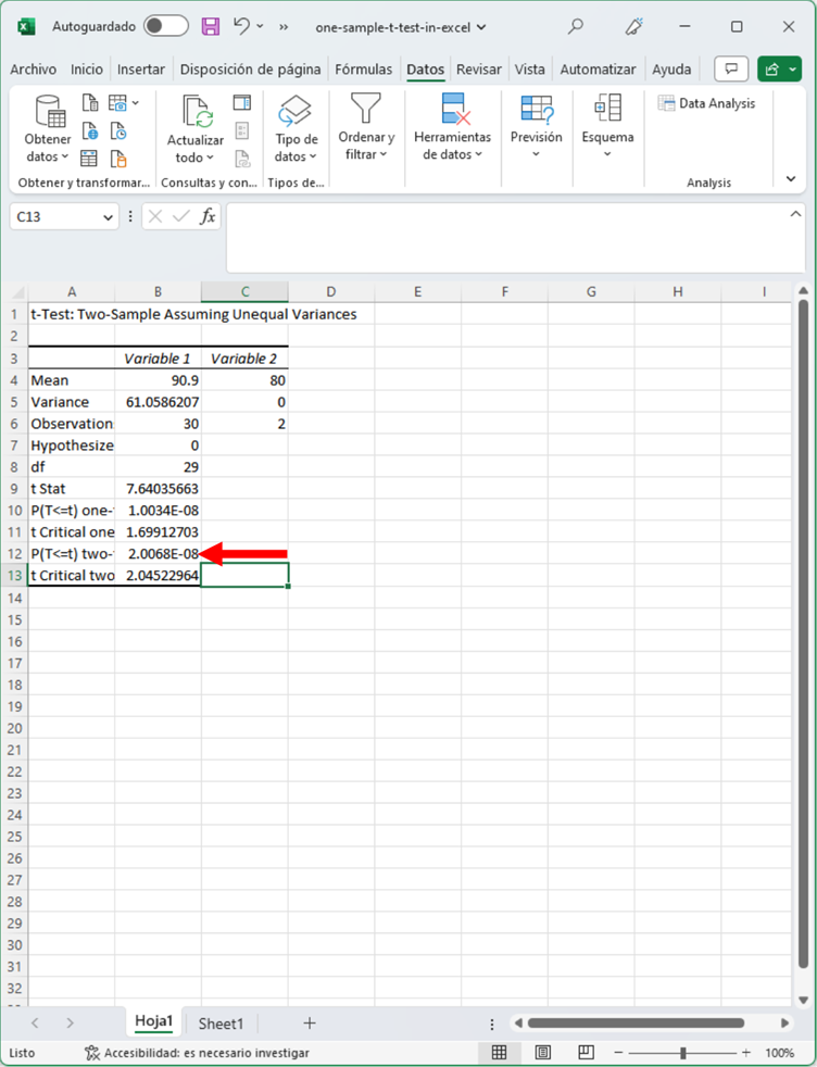 El número resaltado a continuación es nuestro valor p. El cual es 2.01E-08. ¿Qué es lo que hace esa E ahí? Bueno, cuando un número es extremadamente pequeño o grande en Excel, a veces se expresa en notación científica. El número después de la E representa cuántos espacios debemos mover el punto decimal. Si es positivo, movemos el decimal a la derecha y agrandamos el número. Si es negativo, movemos el decimal a la izquierda y hacemos el número más pequeño.