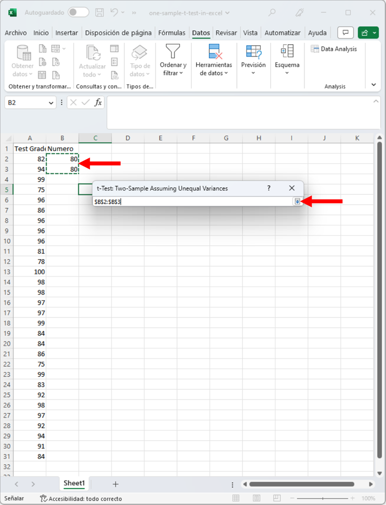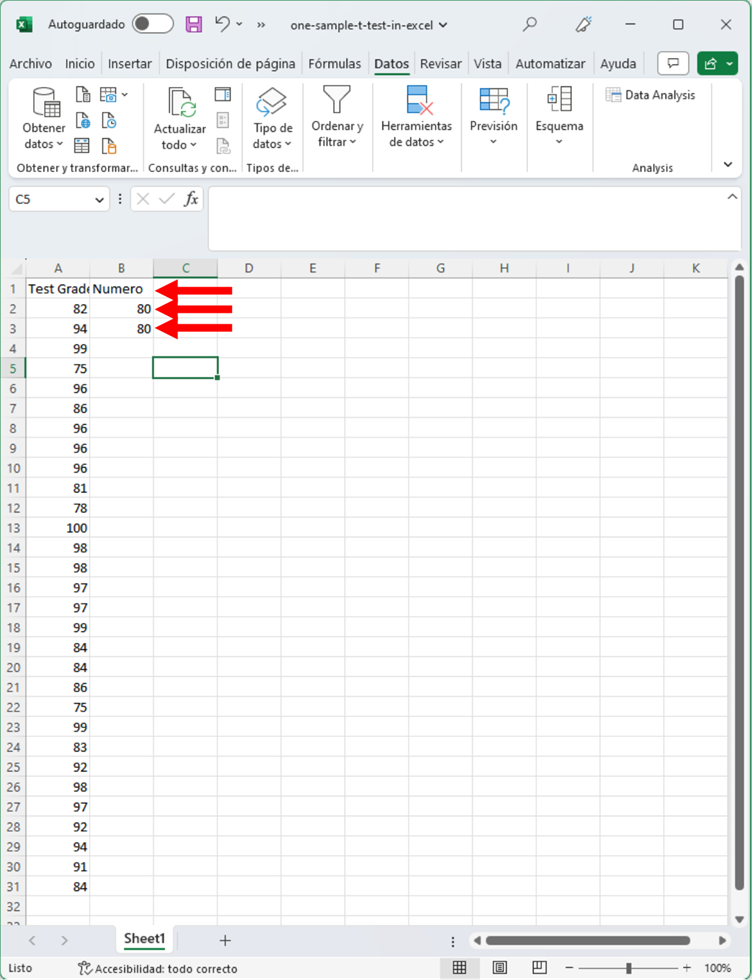 Ahora, debemos comenzar engañando a Excel para que calcule la prueba t de una muestra por nosotros. Comencemos escribiendo tres cosas en la segunda columna. En la primera fila, escriban la palabra “Numero” (sin comillas), que es nuestra etiqueta. En la segunda y tercera fila, escriban el número con el que desean comparar los datos. En el ejemplo actual, elegimos el número “80”. Entonces, escriban “80” (sin comillas) en la segunda y tercera fila de la segunda columna. Su Excel debe verse como la imagen de abajo:
