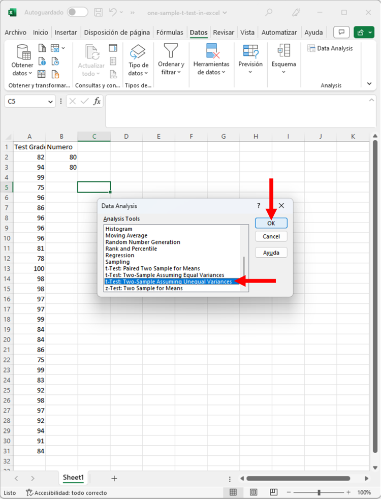 Debería aparecer la siguiente ventana. Aquí es donde se vuelve un poco confuso. Aunque estamos realizando una prueba t de una muestra, deben hacer clic en “t-Test: Two-Sample Assuming Unequal Variances” y luego hagan clic en “OK”. Debido a que Excel no tiene un comando de prueba t de una muestra, debemos engañarlo para que piense que esos dos números que escribimos son otra muestra. Es confuso, lo sé, ¡pero funciona!