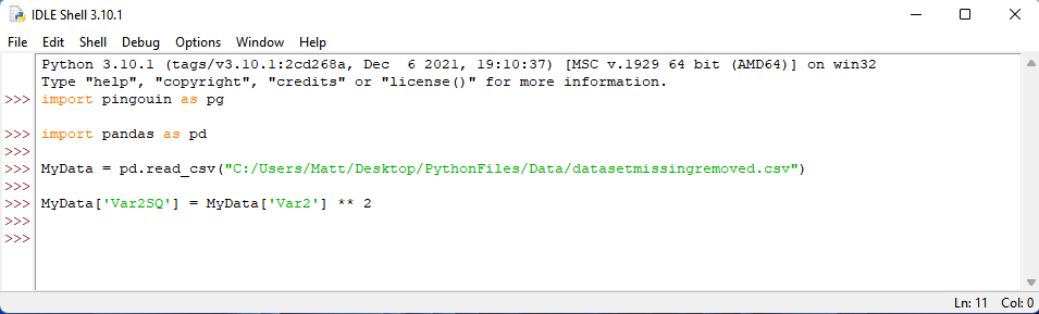 To perform our analysis, we first need to create the new variable that will detect the non-linear effect. For a quadratic regression, this is our predictor squared (Var2^2). We will call it, Var2SQ, in this example. To create this variable, we need to first provide this new label by typing: MyData[‘Var2SQ’] = . Then, we need to tell Python that this new variable should be the square of Var2. To do so, we type: MyData[‘Var2’] ** 2. In Python, ** is used to take a variable to the power of the following number. So, ** 2 indicates that the variable should be squared. Once you have written this syntax, press enter.