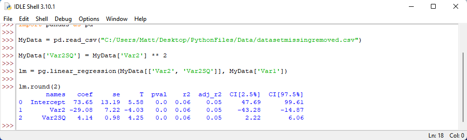 We should then conduct our regression analyses with Var 1 as our outcome and Var2 and Var2SQ as our predictors. If you do not know how to conduct a regression analysis in Python, please refer to my page on the topic. In short, however, we want to assign our regression results to lm by typing the following syntax: lm = pg.linear_regression(MyData[[‘Var2’, ‘Var2SQ’]], MyData[‘Var1’]) . We then press enter.