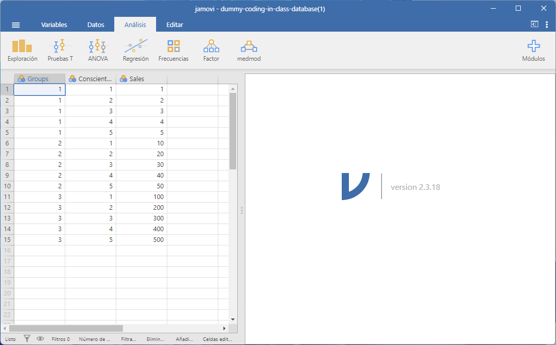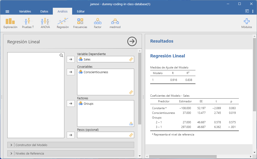 Con la mayoría de los programas estadísticos, tendríamos que crear nuestros variables dummy antes de realizar nuestro análisis con variables dummy. Afortunadamente, Jamovi lo hace por nosotros cuando realizamos el análisis. ¡Qué práctico!